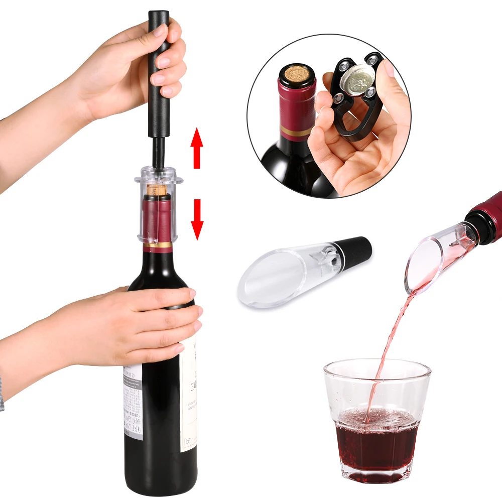 3. despejador de vinho: basta inserir o despejador de vinho na garrafa para despejar o vinho facilmente no copo de vinho para evitar derramamento durante o vazamento.4. O abridor de garrafa de vinho tipo pressão de ar usa o princípio de pressão de vácuo, fácil de usar e rápido para abrir a garrafa de vinho